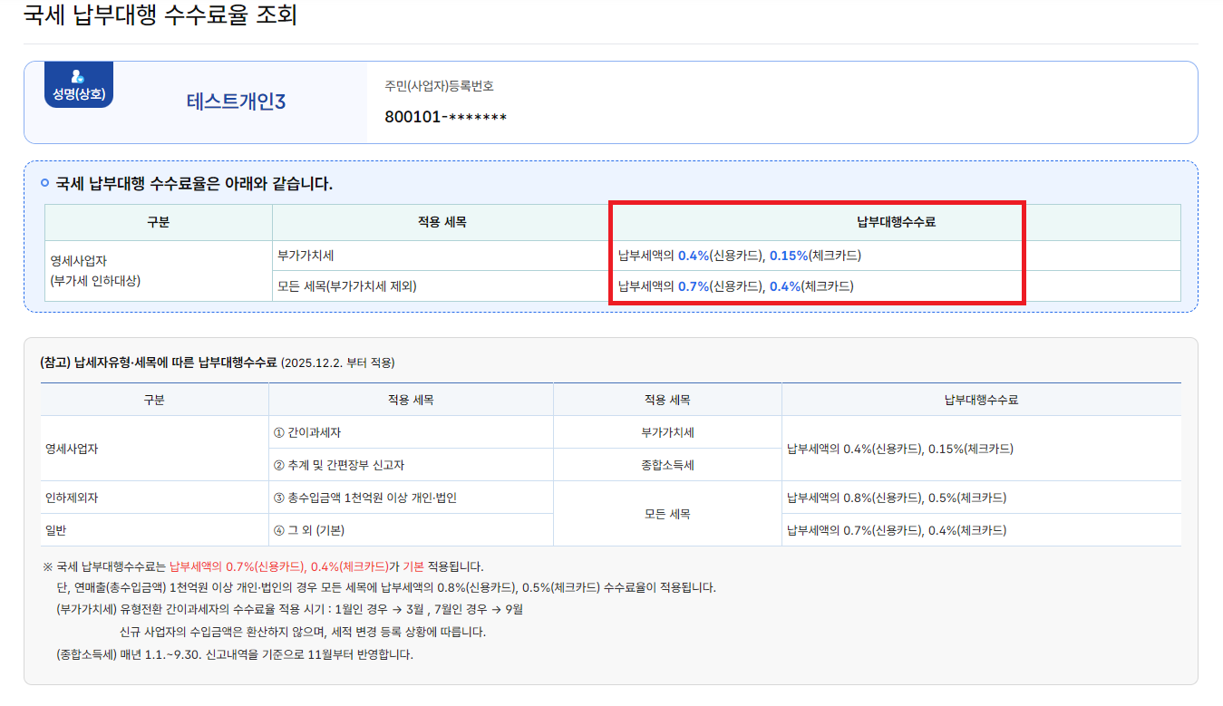 일반 납세자의 경우에도 수수료가 소폭(0.1%p) 인하되며, 영세사업자의 경우 특정 세목에 대해 대폭적인 인하가 적용됩니다.