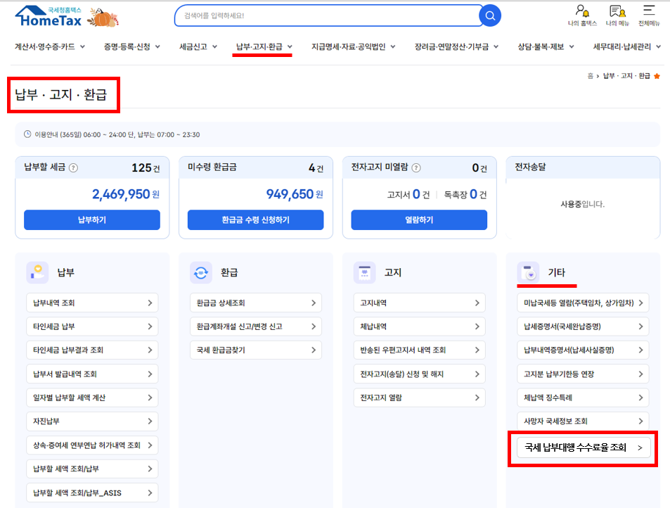 납부·고지·환급 > 기타 > 국세 납부대행수수료율 조회