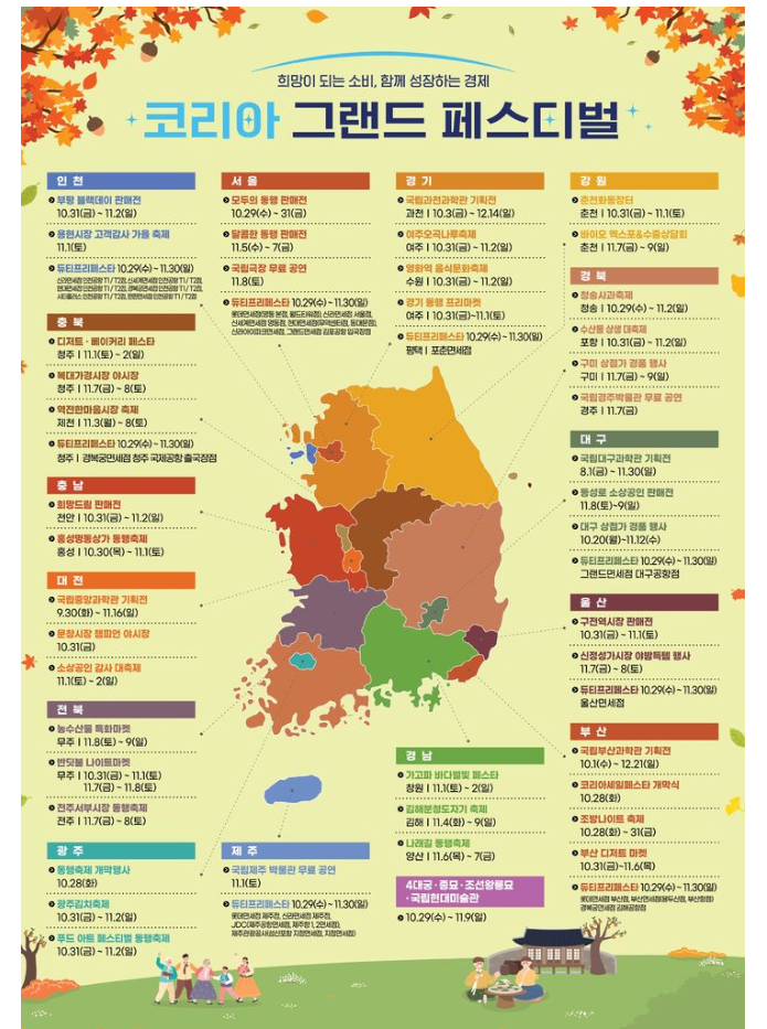 **2025 코리아 그랜드 페스티벌(Korea Grand Festival)**은 2025년 10월 29일부터 11월 9일까지 12일간 진행됩니다. 이번 축제는 정부가 주관하며, 소비 촉진과 경제 활성화를 목표로 다양한 소비 혜택과 대규모 할인 행사를 제공합니다. 전국 곳곳에서 온·오프라인으로 동시다발적으로 펼쳐지며, 국가 차원의 쇼핑 축제로 모든 국민이 혜택을 누릴 수 있습니다.